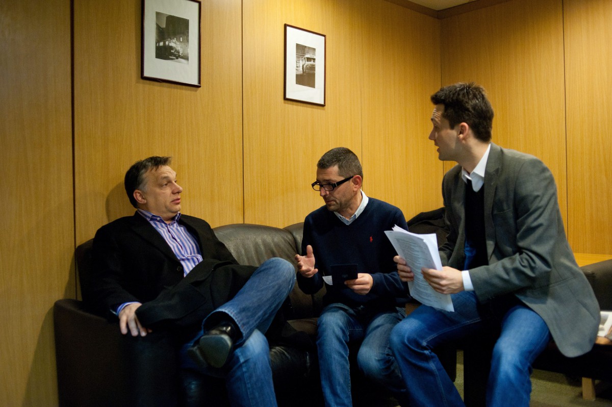 Orbán Viktor miniszterelnök Várhegyi Attilával, az MTVA kommunikációs tanácsadójával és Havasi Bertalan helyettes államtitkárral (b-j) beszélget, mielőtt a miniszterelnök interjút ad élő adásban a Kossuth Rádió 180 perc című műsorában, a Magyar Rádió stúdiójában 2013. február 15-én.